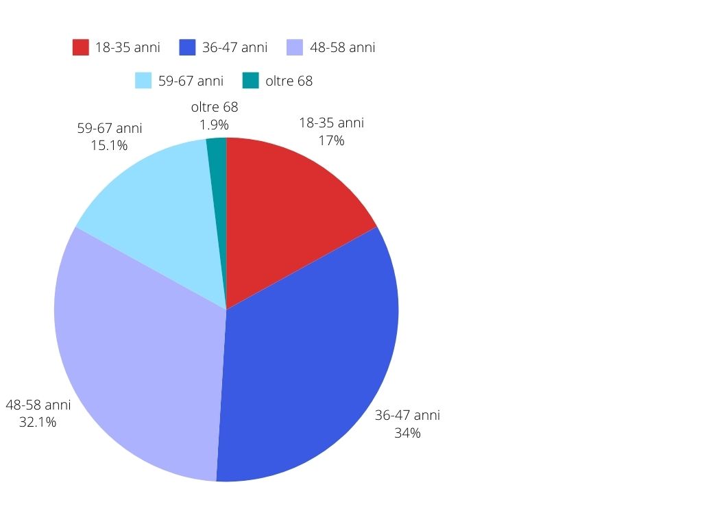 L’eta del campione che ha voluto manifestare digitalmente si concentra nelle fasce 36-47anni (34%) e 48-58anni (32,1%), seguono, con circa la metà del peso percentuale le fasce comprese tra i 18-35anni (17%) e 59-67 (15,1%) e, marginali gli, over 68 (1,9%).
